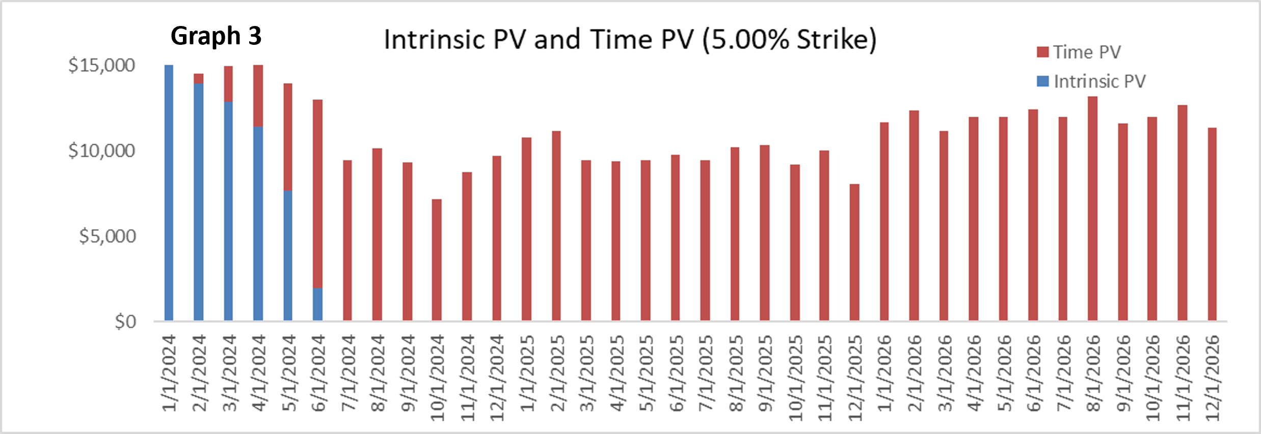 Determining the appropriate strike for a cap can be challenging for buyers. In general, the higher the strike rate, the lower the price. However, cheaper doesn’t always mean better. As we can see if Graph 3 below, our same cap at a 5.00% strike has very little intrinsic value. Of the $400,00 total cost of the cap, $340,000 is time value. If the forward curve is 100% accurate – which we know it never is – the Borrower will be paid $60,000 back over time through cap payments* (intrinsic value).